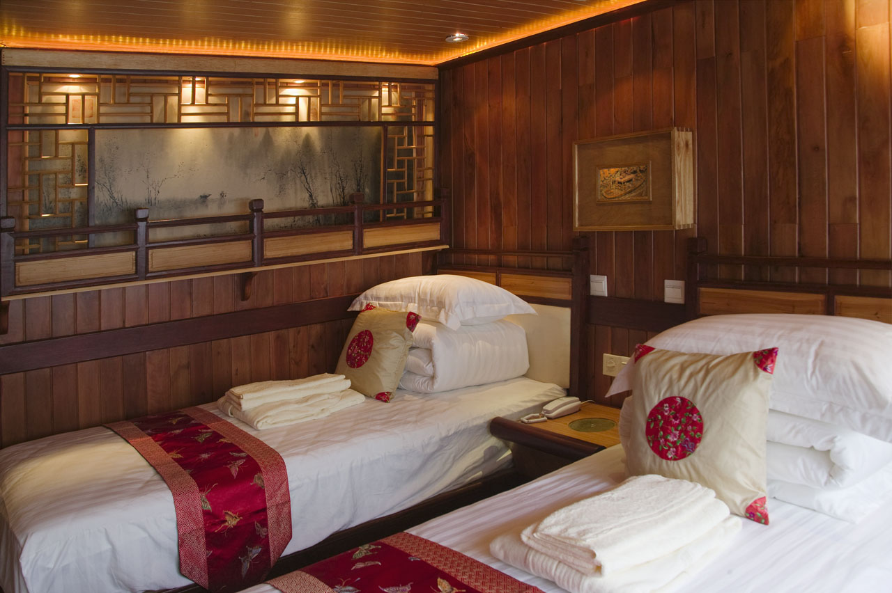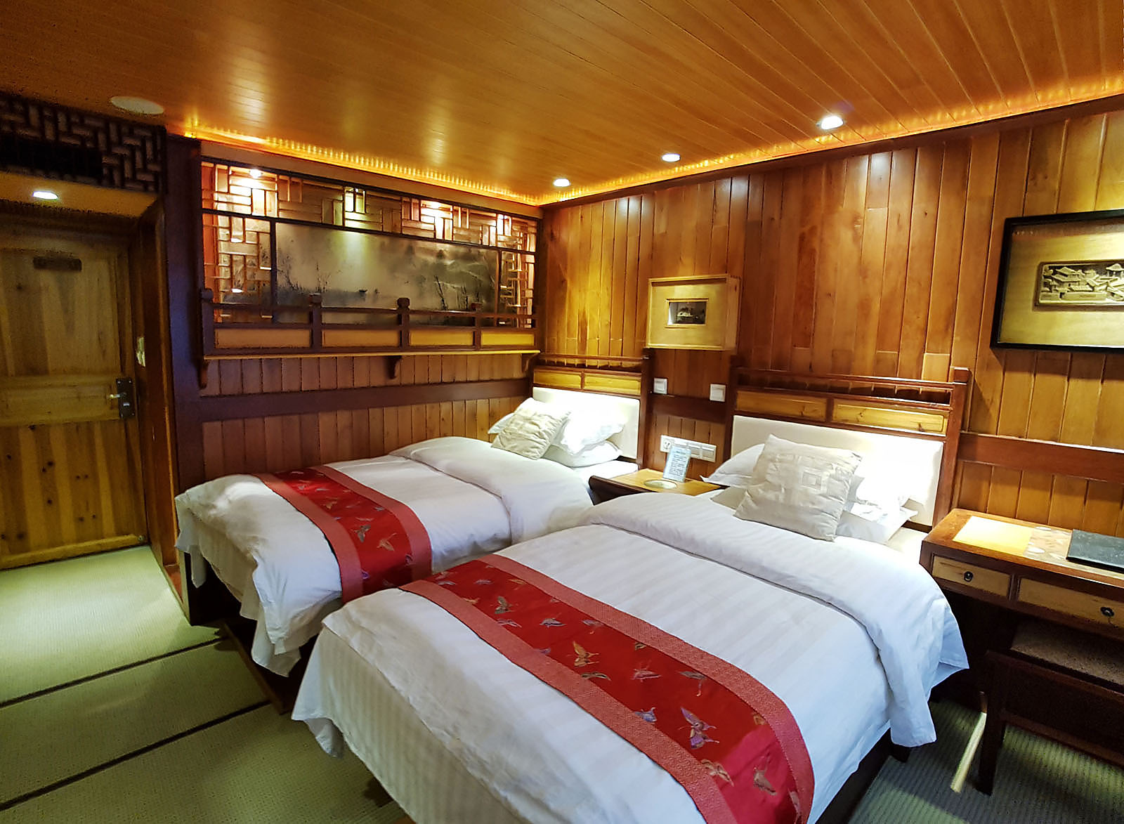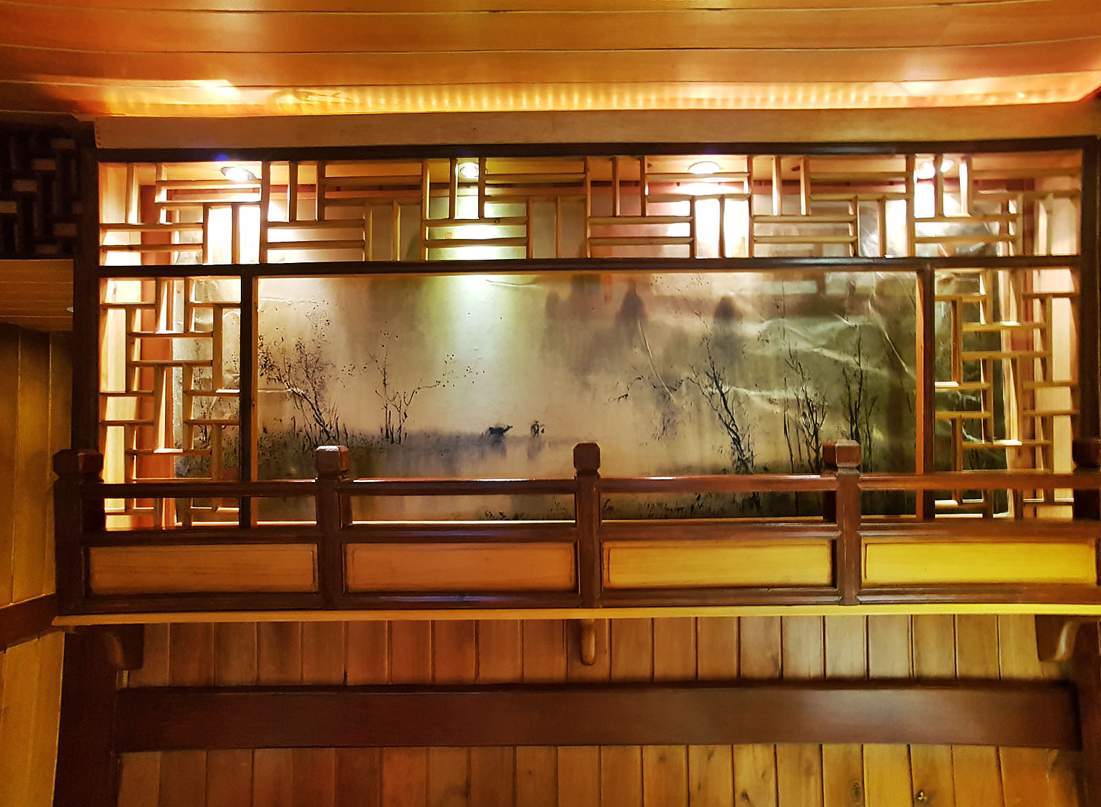 现在我们来介绍一下中国的雕刻工艺。船室配有特殊的手工制作的家具,游客们会感觉到自己像乘坐着一艘古代船只漂浮在水面上一样。由错综复杂的精细木雕装饰成的墙面,让人仿佛身处帝国时代,在那个时代,上至皇室和达官贵族,下至商业人士、知识分子等,都用艺术品装饰自己的房子。除了豪华装饰外,船室里的艺术品还向人们讲述了许许多多引人入胜的故事,这些故事名扬四海,展现了传奇的中华文化。艺术家只选用一种木材,并结合高超的刀工技术,用纯天然的色泽实现了三维效果,表达出了每一个主题与场景所要描绘的氛围。紧跟船舶主题的还有一个罗盘古董,它的展出象征了中国古代的风水哲学。球状骨针和符号反映了人们对风水的信仰,为此中国人在几千年前发明了罗盘,与此同时,导航工具的出现也标志了早期中国在海洋探索领域的发展。我们希望在船室的您能拥有一段如水般宁静顺利的旅程。