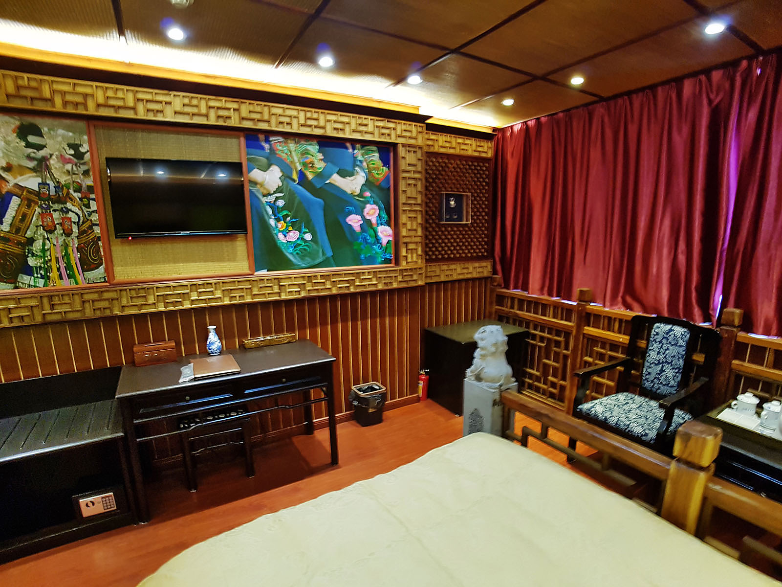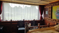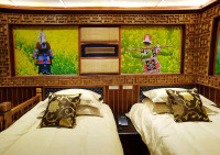 位于贵州安顺的黄果树,以其雄奇壮观、连环密布的瀑布群而闻名天下,享有“中华第一瀑”的美誉。这里瀑布成群,洞穴成串,峰峦叠翠,植被奇特,伏流、溶洞、石林、石壁、峡谷比比皆是,呈现出层次丰富的喀斯特山水的旖旎风光。黄果树瀑布固然美的惊心动魄,贵州的少数民族更让苏克任先生着迷。这里生活着苗、布依、侗、彝、仡佬、土家、回、水、瑶、壮等多个民族。贵州多山,素有“八山一水一分田“之说,几乎找不到大一点的平整土地。封闭的地理位置让贵州在过去罕有人至,但各族人民也因此而得以传承其独特的民族文化。在上世纪八十年代初,苏克任先生首次来到贵州,就被他们绚丽的服装、奇特的节日、神秘的摊戏、精致的刺绣与蜡染深深吸引。对他来说,贵州更像是一座独特的生态博物馆。贵州以苗族人口最多,苗族的族缘非常古老,其中支系旁系更是繁杂,每系都有其独特的服饰、语言和民俗。时至今日,他们仍然沿用农历,春耕秋收,崇拜祖先,祭祀神明。节日时的苗族是最美的,他们盛装艳服,吹笙跳鼓,对歌起舞,欢声笑语,真是摄影天堂。在这间黄果树客房里,苏克任先生特地摆放了他收藏多年的苗族银饰,其中有做工精美的坠饰、头饰和耳环。苗族姑娘擅长织绣,进入苗寨时到处可以看到织布机前姑娘们的妙曼身姿。在此,苏克任先生特地展示她们的织布机局部。悬挂于客房中的大幅照片则让您充分领略多姿多彩的苗族民风民俗。